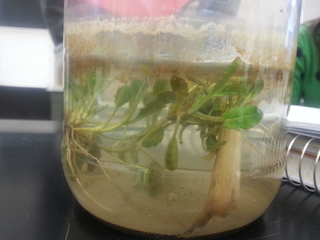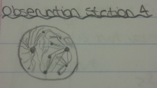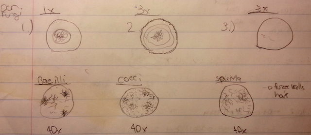 The contents of the jar had a very potent odor. Inside the jar the water was fairly clear with an exception of a brown and green film that coated the top of the water (likely some mold). In the water there were two plants, one that had a thin leafy stalk and one that had a thick white stalk. Organisms near these plants would differ from other organisms because they would likely use the plant as a source of food, oxygen or shelter. There was also a thin layer of sand in the bottom of the jar. A sample was selected from two regions of the jar; the brown film on the top layer of the jar and the bottom of the jar near the leaved plant. Sketches of the organisms observed are located in the third image.