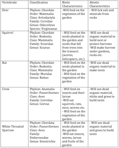 The purpose of this lab is to understand the importance of Invertebrates. The invertebrates were observed and classified which allowed me to connect the significance of each organism within the transect. Vertebrates rely on invertebrates and organic matter for their sustaining of life, and invertebrates rely on plants, bacteria and fungi. Each element that we have studied throughout the various labs is very significant to the ecosystem of this transect. The fabrication of a food web and speculation of potential vertebrates was a very effective method of increasing my understanding of the importance of invertebrates.