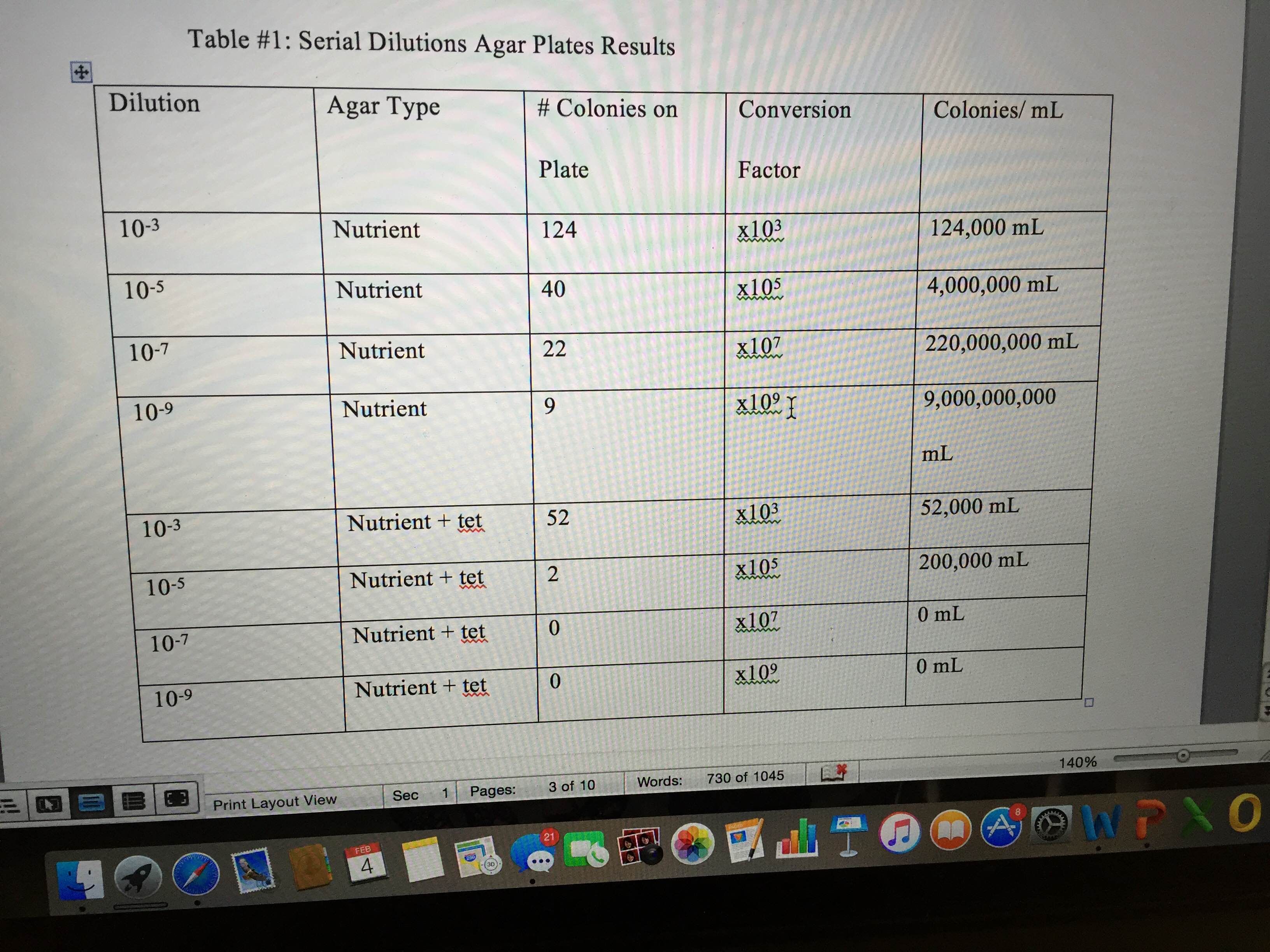 In this experiment we made a wet mount of organisms we already knew about and then used the Dichotomous Key to determine that organisms identity that was know to practice and learn how to use the Dichotomous Key. As a group we then took our Hay Infusion and made three wet mounts one from the top niche, one from the middle niche, and one from the bottom niche. After we observed them on the microscope and identified one organism from each niche in the hay infusion. Later we prepared the serial dilutions that are going to be observed in the next lab. We labeled four tubes of 10mLs sterile broth 10-2, 10-4, 10-6, 10-8. We took eight plates four with nutrient agar and four nutrient agar plus tetracycline and we labeled one plate from each group with 10-3, 10-5, 10-7, 10-9. We pipetted 100micro/liters from the Hay Infusion to the 10mLs of sterile broth into the tube labeled10-2. Another 100micro/liters of broth were taken from tube 10-2 and were passed to the tube labeled 10-4 and the same procedure was done to make the 10-6 and 10-8 serial dilutions. To create the serial dilutions on the plate we pipetted 100micro/liters from the 10-2 tube and placed them in the agora plate labeled 10-3 and was spread. The exact procedure was made for the three remaining plates. The 100micro/liters from the 10-4 tube were placed on the plate labeled 10-5, the 10-6 100micro/liters were placed in the plate labeled 10-7 and the same amount also was taken from 10-8 and placed on the 10-9 plates. These serial dilutions were left in the rack for one week to develop.