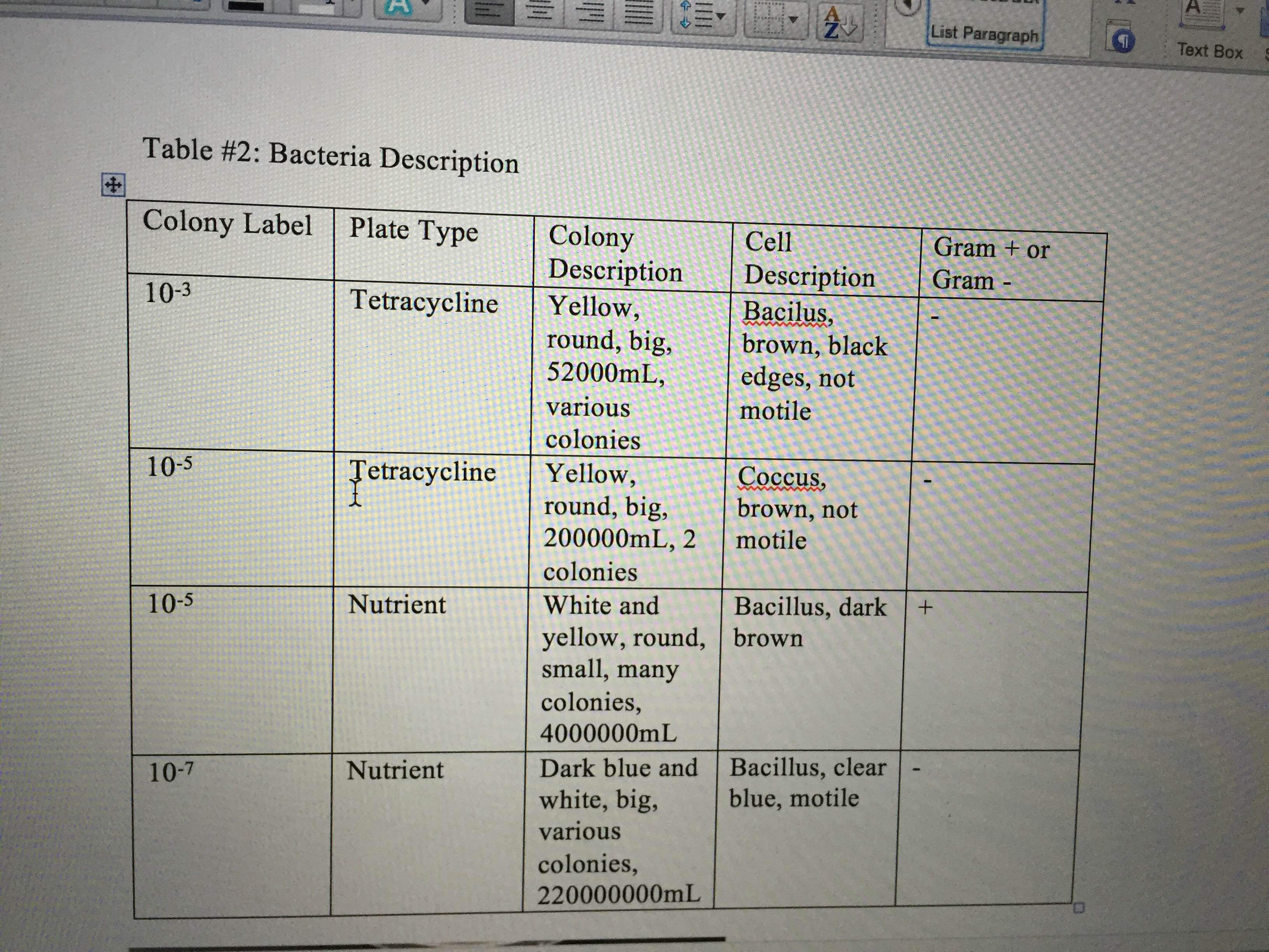 3 February 2016 Lab III: Process of Identification of Bacteria I. Introduction In this experiment we are trying to observe the diversity of bacteria in our transect from the samples of our hay infusion that were place in agora plates. Nonetheless, we want to identify which specific bacteria are in there-by-their features such as: colony morphology, shape, motility and gran stain. Also we want to test their resistance to the antibiotic tetracycline since samples of the hay infusion were placed in agora plates with tetracycline. II. Materials and Methods To quantify and observe these microorganisms and all of their features we observed the agora plates that were left cultivating last week and counted the number of colonies on each plate. Evidently to know how many colonies were present on a plate we counted them, but to know the number of colonies per millimeter each agora plate had a different conversion factor that mas multiplied by the number of colonies on a plate, conversely the conversion factor was the same regardless if the plate had the presence of tetracycline. Agora plates labeled10-3 have a conversion factor of x103, plates10-5 have a conversion factor of x105, plates 10-7 have a conversion factor of x107 and plates 10-9 have a conversion factor of x109. To test the resistance of the bacteria’s to tetracycline we observed the number of colonies on each plate with and without tetracycline and compared the results. The cell shapes and the motility of these organisms needs to be observed under a microscope, for this reason we did a wet mount for four plates two with tetracycline and two without tetracycline; we chose 10-3T, 10-5T, 10-5, and 10-7. To do the wet mount procedure we sterilized a loop over flame and scrape up a small sample from the plate and mixed it with a drop of water on a slide and placed a cover slip over the mixture. This was done four times. Because it is hard to observe bacteria in the microscope we did the gram stain procedure. We took the wet mount slides that were prepared and took off the cover slip and covered the bacterial smear with crystal violet for 1 minute and rinsed it with water. Covered the bacterial stains with Gram’s iodine mordant for 1 minute and once again was rinsed with water. The slides were decolorized with 95% alcohol for 10-20 seconds. We covered the slip with safranin stain for 20-30 seconds and rinsed it off with water. The excess was cleaned with a Kim wipe and were observed under 40x and focused on the gram stain. Later to amplify the 16S rRNA gene a PCR reaction was set. We choose one sample with tetracycline (10-3T) and one without it (10-5). We labeled the 2 PCR tubes and added 20µl of primer/water mixture to each. With a toothpick we took a small sample of bacteria and placed it inside each indicated tube a different toothpick was used for the two samples after each tube was mixed to dissolve the PCR bead and was placed in the PCR machine. Next week the PCR products will be run on agarose gel. III. Results The results of the colonies on each plate varied greatly. The plates that had the presence of the antibiotic tetracycline had less number of colonies or none compared to those that had no tetracycline, the difference can be observed in Table #1 and Figures 1 through 4 demonstrate how the plates looked. Nonetheless, the plates with tetracycline that had bacteria on them must have been insensitive to antibiotics or were resistant to antibiotics. The cells observed and their details are described in Table #2. Figure 5 shows the cells observed on the 10-5T wet mount slide. Figure 6 shows the cells observed on 10-3T wet mount slide. Figure 7 shows the cells on the 10-5 wet mount slide and Figure 8 shows the ones observed on the wet mount slide 10-7. After the gram stain procedure was done and the slides were observed they were described in Table #2. Figure 9 shows the cells observed on the 10-3T Gram Stain slide. Figure 10 shows cells on the 10-5T Gram Stain slide. Figure 11 shows cells on the 10-5 on the Gram Stain slide and Figure 12 shows cells on the 10-7 Gram Stain Slide.