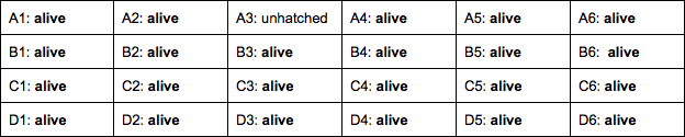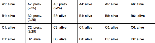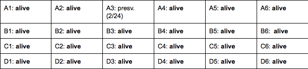 Still alive: A4, A5, A6, B3, B5, B6, C1, C3, C5, D2, D3, D4, D5, D6 Preserved: A2, B2, C2