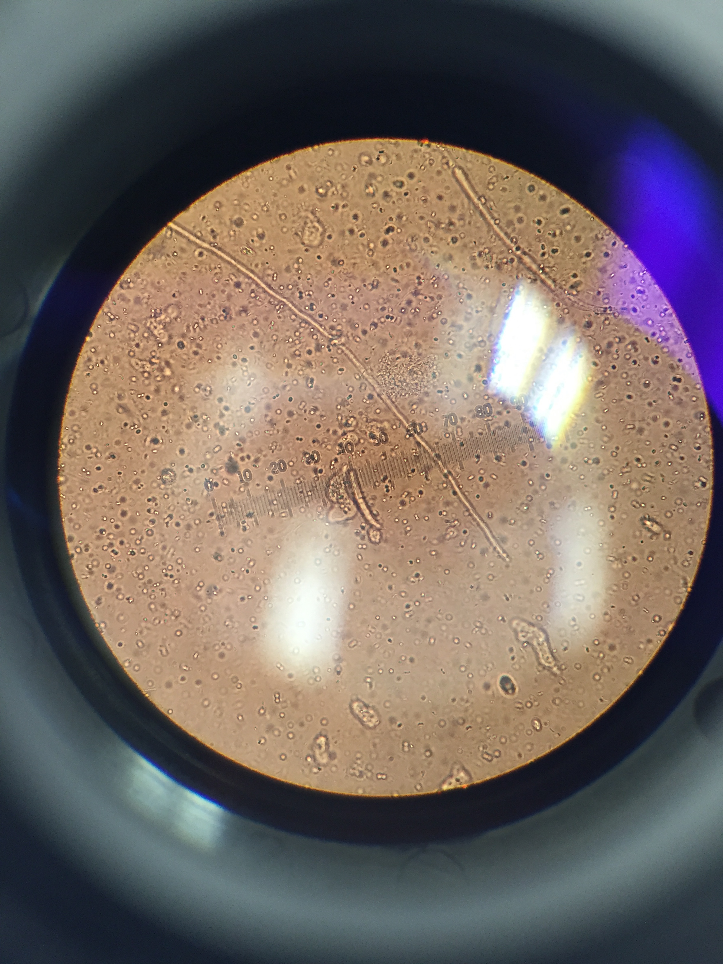 (d) taken from area under the bench - closest to mold & fungi piece [total of 1 found in this section] colorless single, motile cells, creeping (sliding), -no visible rays, but assumed =