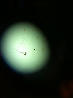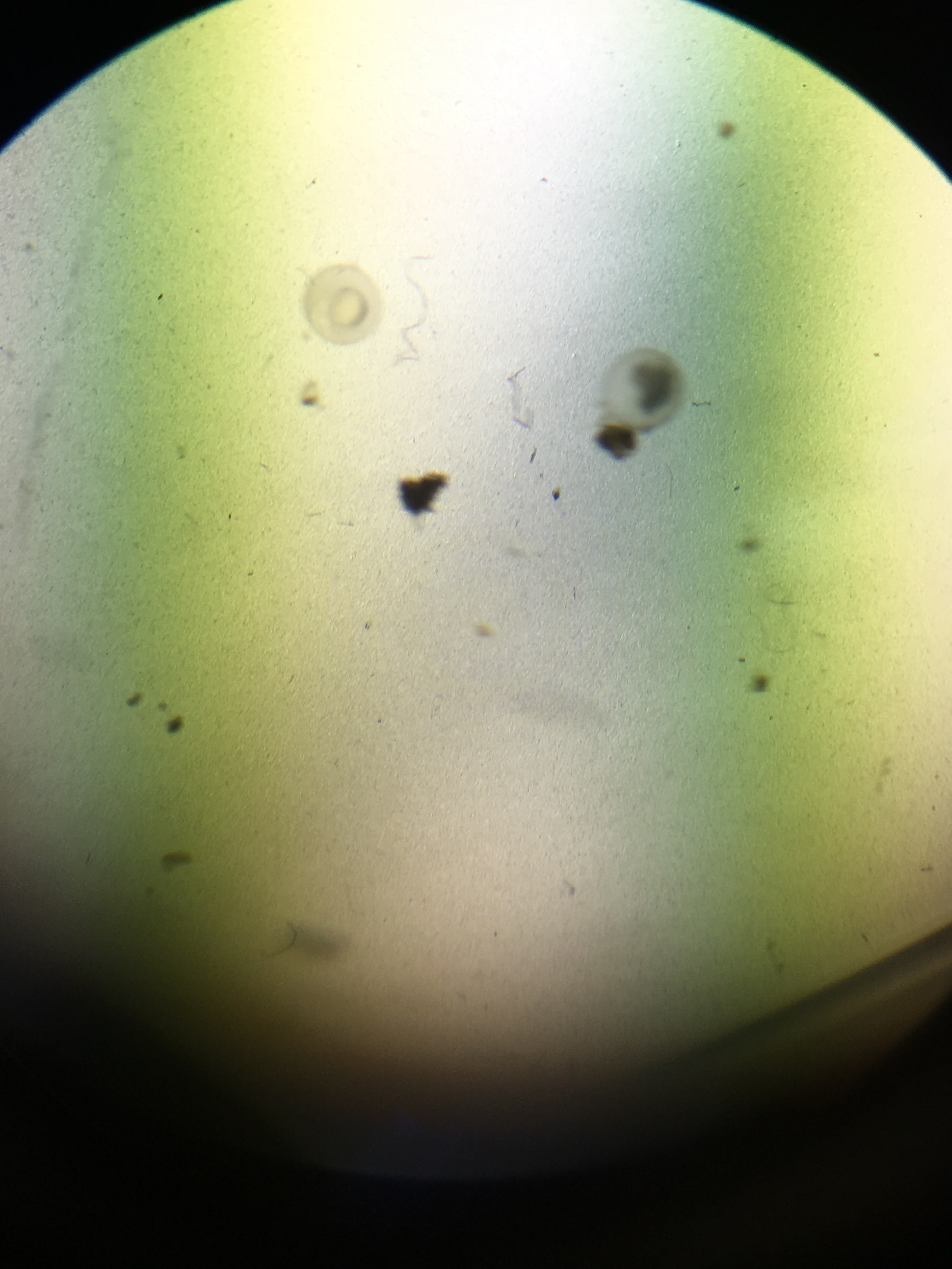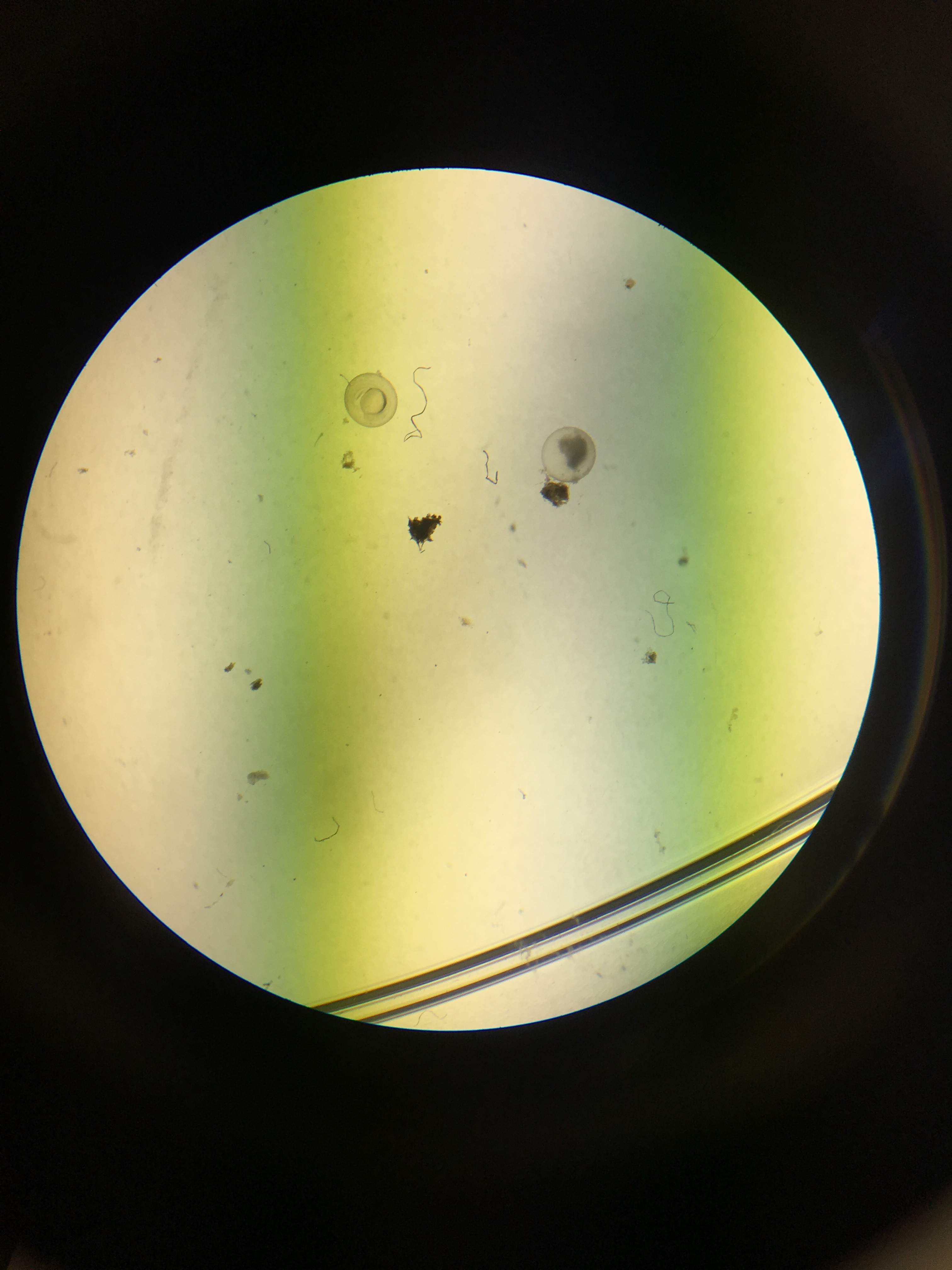 Top Phylum: Nematoda Class: Enoplea Length-22.2 Number found-1 The organism was alive constantly sliding along the slide. It had a clear complexion and an elongated, segmented body. The body had a bilateral symmetry, while the head showed a radial symmetry. Because the body was transparent a digestive system was observed.