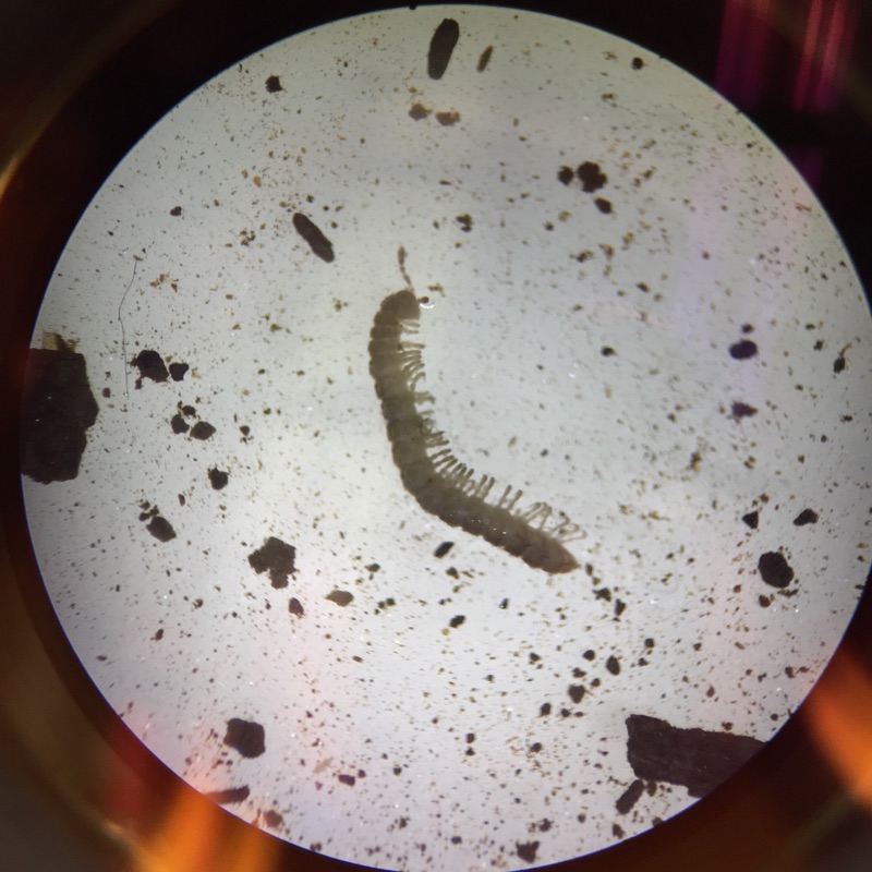 Bottom Phylum: Arthropoda Class: Diplopoda Length-8 Number found- 1 The organism was dead, with an elongated flattened body with segments, to which sixteen pairs of jointed legs were attached, with. It was also seen that the organism was bilateral and had two segmented antennas.