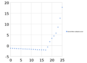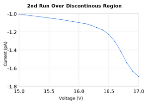 Both of these sets of data produced peaks that were close to the accepted values for the excitation energy of neon as well as the ionization energy. To analyze the data we took the average of the peaks found in the two measurement runs. It should be noted that for the peak at 19.6V there was only one set of measurements that had a maxima there, and it was a rather small deviation at that, it can be see on the graph as the second small bump. SJK 23:49, 12 October 2010 (EDT)