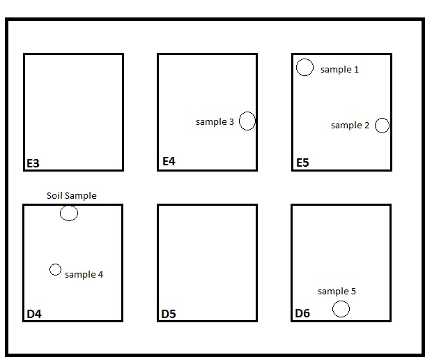 •Biotic components- leaves, grass, plants/vegetation in box E5, clovers, a bush, roots, and flies. There was also evidence of squirrels, though we did not observe them while we were there.