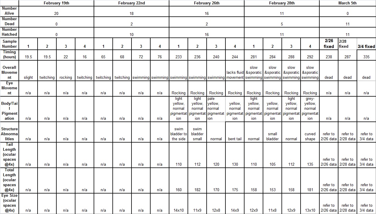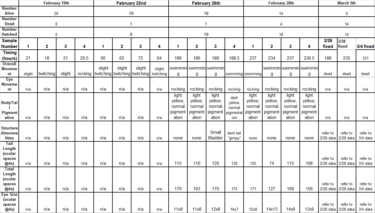 2. The eggs were then observed to determine the approximate age, movement, structures, tail length, total length, eye measurements, and