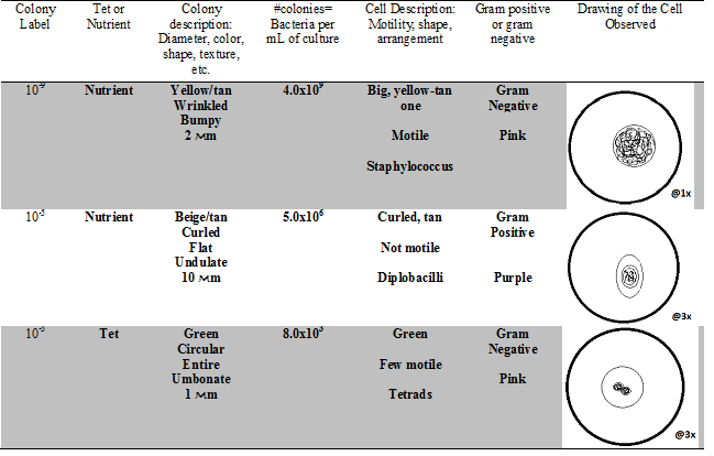 This lab allowed me to identify different types of bacteria through analyzing the different organisms in the hay infusion culture. Characterization of bacteria can be achieved by observing the size, shape, motility, and staining color of the organism. We also determined that bacteria grows at a much faster rate when tet is not present on the plate, showing that antibiotic severely inhibit the growth of different bacteria.