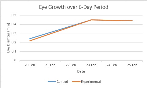 The hypothesis for the experiment was not met. As is evident from the graphs, the experimental fish had neither smaller body or eye size as expected. Unfortunately the scope of the study was not significant enough to draw any conclusions, since there was some data missing and neither treatment survived the entire course of the experiment. It remains likely that the hypothesis would have been met, had more data been collected. However, the experimental fish did exhibit some more erratic behavior than the control fish, which may have been one consequence of their being raised in the ethanol solution.
