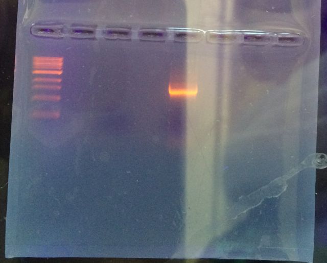 First we loaded our DNA samples into the gel with the ladder and ran the PCR. When the DNA had travelled the majority of the length of the gel, we removed the gel and imaged it.