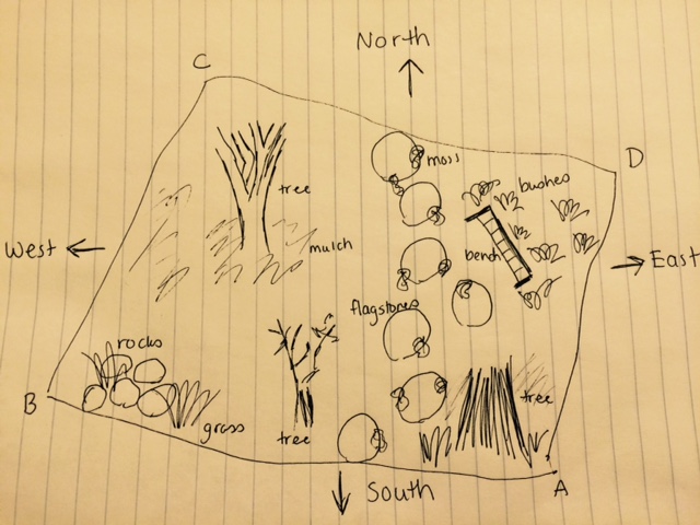 Biotic elements: trees (3 varieties), grasses (3 varieties), mulch, moss, berries. Below is a map of the transect, as well as some photographs.