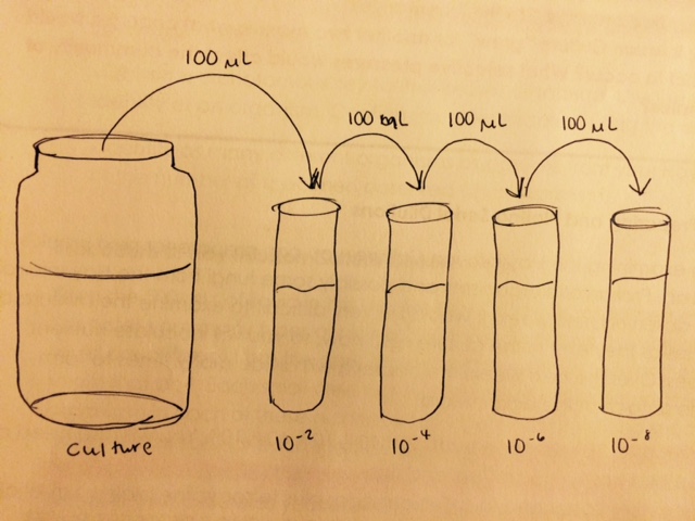 After examining our two wet mounts under the microscope, we performed a serial dilution of the culture in growth medium, and then transferred 100 ul from each tube onto nutrient agar plates. The serial dilution process is detailed below.