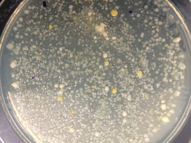 We noticed that blue colonies grew only on the non-antibiotic-treated plates. The colonies on the untreated plates were much more numerous, which was in line with expectations. The lower the dilution, the more bacteria per plate. The most dilute tet-treated plates contained no visible colonies. The gold-colored colonies seemed to thrive best on the least dilute tet-treated plate, but they did not survive the serial dilution. None of our plates contained any traces of fungi growth.
