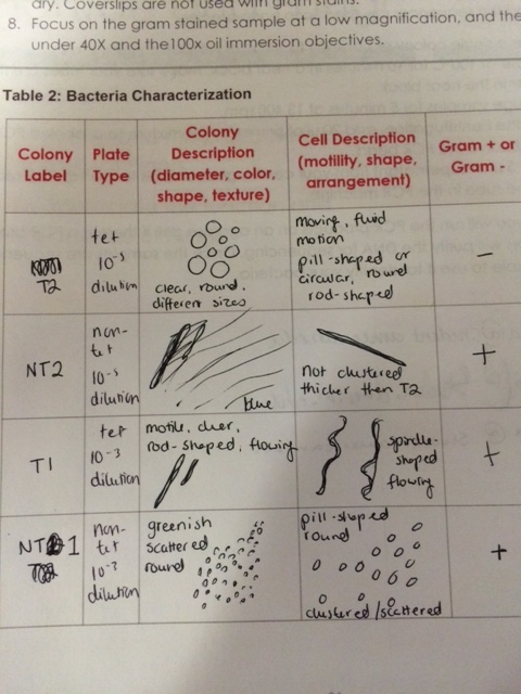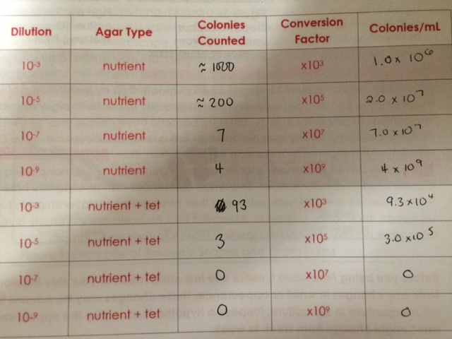 The janthinobacterium lividum was identified as the sample taken from the non-tet plate at a 10-5 dilution. We had marked it as Gram-positive, although the janthinobacterium are Gram-negative. The chryseobacterium were not examined under the microscope or stained with Gram stain, but they are easily identifiable in the photos as surviving best on the tetracycline-treated plates.