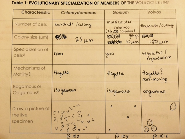 Today in lab we examined the concept of evolution, using three members of the Volvocine line as an example. Organisms in the Volvocine line belong to the green algae group, Chlorophyta. The three organisms that we viewed, ranging from least to most complex, were Chlamydomonas, Gonium, and Volvox. The chart below details observations collected on each genus.