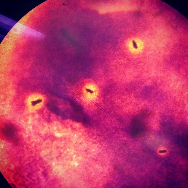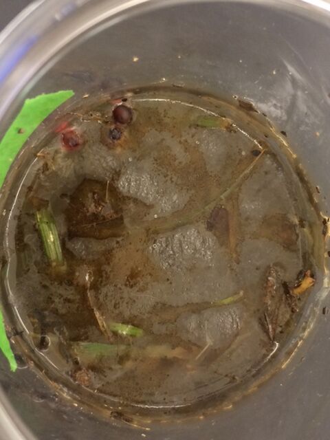 Finally, we broke down our Burlese funnel and observed it. The funnel had been set up last week with a screen in the bottom and 500g of leaf litter from our transect on top. The idea was that the tiny invertebrates residing in the leaf litter would fall through the screen into a conical tube and be fixed in the 50:50 ethanol/water mixture for us to observe. The funnel was fit into the conical tube and wrapped with serafilm; we then attached this to a ring stand and left it standing under bright lights with everything covered in aluminum foil for one week. This week, we freed the conical tube, unwrapped the serafilm, and pipetted 15mL off the top of the mixture into a petri dish. We then poured the remaining 15mL of liquid into a second petri dish, and inspected both beneath a dissecting scope.