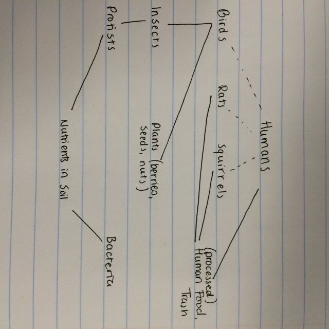 As shown in the above food web, there is a strong connection between the small percentage of organisms that were unearthed in this study. One change in the populations of one of these species could have an effect at every level of the food web. There is also a sense of the interconnectedness of this transect with the larger AU campus and DC as a whole, since these organisms, especially the vertebrates, are not tied to this transect but travel between this and other environments at will.