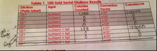 Conclusions: My prediction was correct in saying that I thought there would be some growth on the regular agar plates, but bacteria only grew on one of these plates. My prediction was incorrect in saying that no bacteria would grow on the Tet plates, bacteria grew on one of these plates. We determined that some of our bacteria was antibiotic resistant, and that is why it grew on the Tet plate, but it only grew on the least diluted plate. On the 10-5, 10-5 with Tet, and 10-7 with Tet plates fungi was growing. We also determined that our colonies were all circular, and the we had orange colored ones, and white colored ones. We can use the fungi plates later to determine what type of fungi is growing on them. The objectives were all addressed in this experiment.