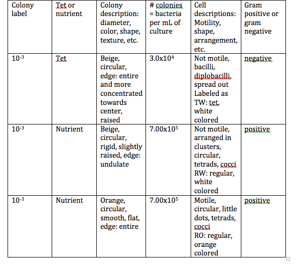 We labeled our colonies with the letters RW (regular-white colored), RO (regular-orange colored), and TO (tetracycline-orange colored).