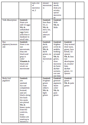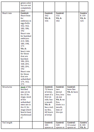 Discussion: The heart rate was not measured everyday because it was very hard to observe. Swimming was not recorded everyday because this did not change drastically everyday. Hatching was not observed after Day 5 because they were all hatched by then. Overall, the zebrafish in the Vitamin A were paler in color to the control ones. They did not develop as fast as the control group. The eyes of the Vitamin A group did not develop as much as the controls. In the fixed samples, the eyes were leaking out of the sockets. The tails of the Vitamin A group were smaller, and bent. This caused these zebrafish to move in an erratic spiral as opposed to the control ones who moved the tail side-to-side in order to move. This also caused them to move slower, and they rarely moved. For humans, this means that too much Vitamin A could result in eye deformation, deformation of other body parts, and development could be slowed. This could also result in motor reactions be slower. One limitation of this experiment was that it was very hard to examine the heart rate of the zebrafish. In order to get rid of this, they could be examined at a higher power, and there could be a timer to time the heart rate for a certain amount of time. These zebrafish could be observed for a longer time period in order to collect more data on them. A mammalian animal could also be tested to see if the same results are produced.