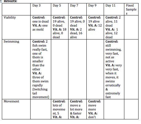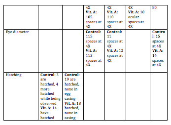 Day 3: The viability, swimming, yolk absorption, heart rate, structures, and hatching will be observed. Any dead zebrafish will be removed with a transfer pipette. Then, 10 mL’s will be removed from each petri dish to be replaced with 10 mL’s of clean water in the control dish and 10 mL’s of Vitamin A in the test dish. Any dead zebrafish will be saved in paraformaldehyde.