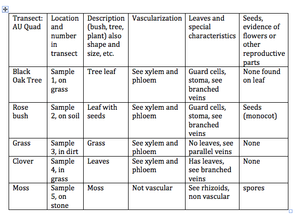 3. Table 1 was then filled out by describing the vascularization of our plants, the leaves and any specialization, if there was any evidence o f any reproductive organs, and classifying any seeds as monocot or dicot.