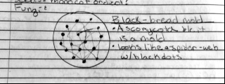 Conclusion: In this lab, we found out that in our transect we had a Black Oak tree, a rosebush, grass, a clover, and moss. We also determined that the fungus we were looking at was Black-bread mold. The objectives were reached by looking at the fungus, and also examining our plant samples. When we set up our Berlese Funnel, we did not put the leaves at the bottom of the funnel so this could affect our results when we look at our invertebrates next week. To have prevented this, we could have put the leaves at the bottom of our funnel.
