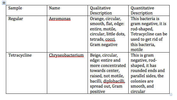 Discussion: Sample one, which is named Aeromonas, was observed to be motile, circular, and had circular edges. According to the quantitative results shown in Table 1, the Aeromonas is motile, but it is rod shaped with rounded edges. Both the qualitative data and the quantitative data proved that this bacteria is Gram negative. Both agree that there is a cocci shape to this bacteria. Sample two, which is named Chryseobacterium was observed to be circular with an entire edge. This bacteria was not observed to be motile, and looked to be Gram positive as shown in Table 1. The quantitative data shows that this bacteria was rounded edges, and the colonies are smooth and circular. According to the quantitative results, this bacteria is Gram negative.