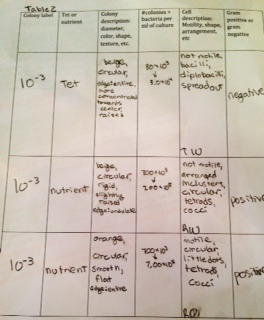 What does this indicate? This indicates that these bacteria are able to grow more easily without the antibiotic. It also indicates though, that these bacteria are antibiotic resistant since there was a considerable amount of growth on the 10-3 plate with Tet.
