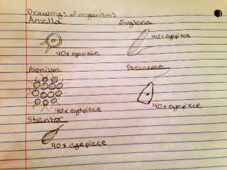 Conclusions: There was Arcella, Euglena, and Gonium on the slide that had the sample from the top of the Hay Infusion. There was Euglena, Peranema, and Stentor on the slide with the sample taken from the bottom. The Hay Infusion seemed to stop growing things on the surface, which could be because it did not have enough nutrients to sustain itself for this long, so whatever was growing on the surface died. The bottom was still growing so it still had enough nutrients to continue to live. The objectives were addressed because we learned how to use the dichotomous key, and learned the distinctions between Algae, and Protists.
