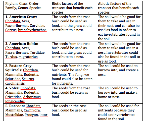 Conclusion: Our Berlese Funnel did not work very well, we were only able to see one invertebrate, this is because we did not put the leaves at the bottom of our funnel. Next time, we could put our leaves at the bottom to see if this produced different results. Our objectives were met because we learned how invertebrates are important, and how simple systems evolved. My guess is that voles, raccoons, the American Robin, the American Crow, and the Eastern Grey Squirrel inhabit our transect because these are common animals in the D.C. area, and have been seen on campus. In looking at the invertebrates from West Virginia and our transect, it was determined that the smallest was the soil mite, and the largest was the centipede.