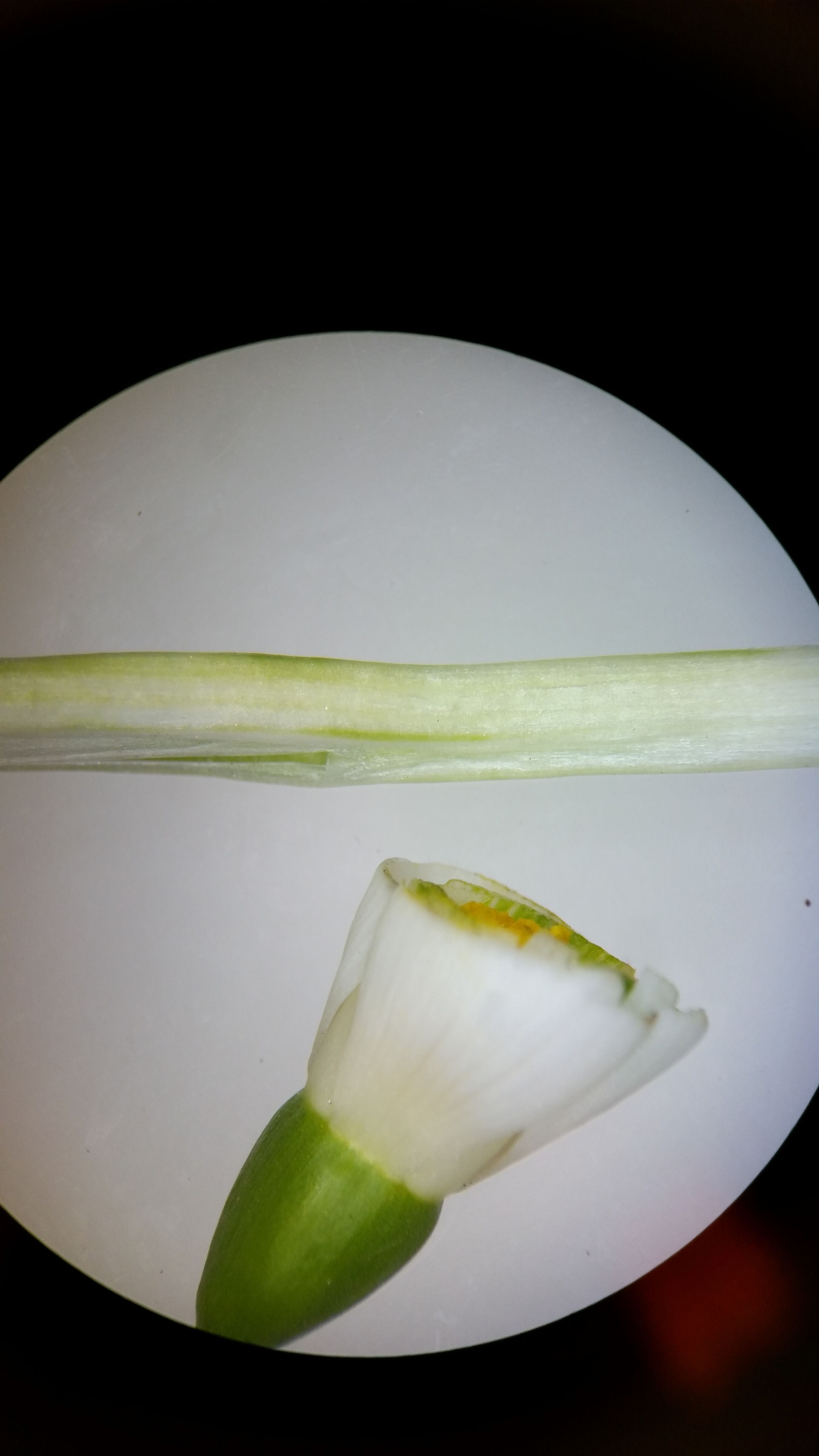 Plant #5: There are not many grouping of this plant in the transect, with around four to six total around the benches. The leaves are short and relatively stubby, with a small, white bud growing from the top of one of the leaves. The stems reach far into the ground, relative to the leaf length; 6cm and 3cm respectively. A cross section of the bud yielded similar results to Plant #3, where some filaments and pollen where evident when looked at under the dissection scope. The veins of the leaves had a parallel pattern, showing that this plant is monocot.
