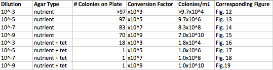 Table 1. Chart showing the type of Agar plate used and how many bacterial colonies were identified on those specific plates, and the conversion used to determine the number of colonies/mL