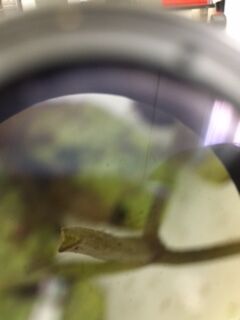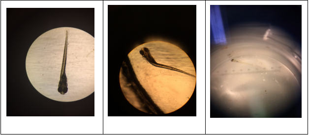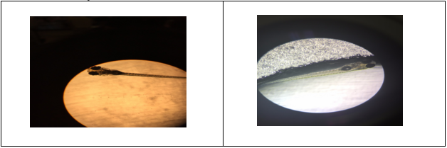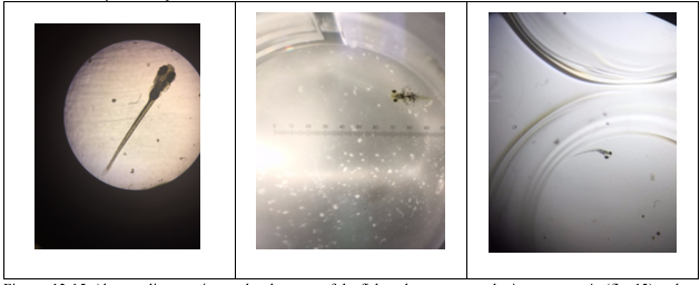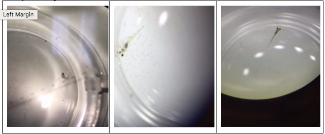 Figure 52-54. Abnormalities seen in fin development and swimming abilities of the fish under a compound microscope at 4x (fig. 52-53) and a dissecting microscope (fig. 54). Fig. 52 shows normal fin development and fig. 53-54 show abnormal fins leading to difficulty swimming and decreased motility. Fig. 53 shows a normal fin on the left side and an anomalous right fin that can not be seen due to its small size or lack thereof. Fig. 54 shows a fish that did not develop any fins and as a result, is seen floating on its right side, unable to swim.