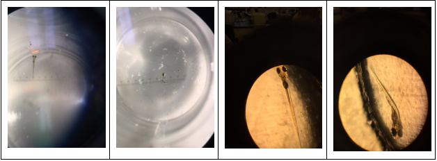 Days 4, 7, 11: On these days, the zebrafish were placed in a depression slide and viewed under a compound microscope at 4x, where more detailed observations could be made. Specific attention was given to the developmental stage of the fish, any physical abnormalities present (e.g. lack of movement, startle response, protruding jaw, underdeveloped swim bladder, absence of or delayed fin development, and abnormal body curvature, size, and/or pigment), development and movement of eyes, and heart rate. Where applicable, the ocular micrometer was used in taking measurements. After observation were made, the fish were returned to the well plate. Maintenance of water levels continued and fish were fed 15 μL of brine shrimp.