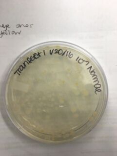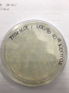 Materials & Methods: Two PCR tubes were labeled with specific transect numbers, identification of specific bacterial colonies, and our group number. 20μL of a primer/water mixture was added to a labeled PCR tube and it was mixed until the PCR bead was dissolved. A sample of the bacterial colony in question was obtained using a toothpick, which was then submerged into the PCR tube containing the primer/water mixture. Once the bacteria had been fully dislodged from the toothpick, the PCR tube was closed and placed into the PCR machine. The same procedure was repeated again using a different bacterial colony. The next lab, the PCR was run onto an agarose gel.