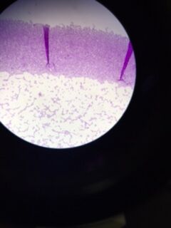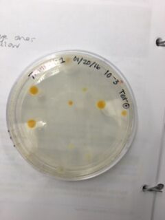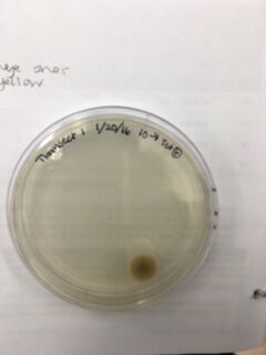 Data & Observations: It is evident from table 1 that there was a difference in number of colonies counted between the nutrient Agar plates and the nutrient and Tet+ plates: the nutrient plates showed significantly more colonies than the Tet+ plates. With the exception of the 10^-3 Tet+ plate, the other Tet+ plates contained only one colony. This indicates that Tetracycline is effective at neutralizing bacteria; in fact, only 21 different species were unaffected by the tetracycline and able to grow on the plates. Tetracycline works by inhibiting protein synthesis by "preventing the attachment of aminoacyl-tRNA to the ribosomal acceptor (A) site"(Chopra et al 232). Tetracycline is effective against both gram positive and gram negative bacteria as well as "atypical organisms such as chlamydiae, mycoplasmas, and rickettsiae, and protozoan parasites"(Chopra et al 232). My group had difficulty finding bacteria, so only two, rather than four, observations were made. One was from the Tet+ 10^-3 plate and the other was from the Tet+ 10^-7 plate. The colony observed from the Tet+ 10^-3 plate was circular with a curled edge, a smooth and glistening surface, and a convex elevation; it was approximately 1 cm in diameter and a mustard yellow color (see fig. 16). It's cells were non-motile, spirochete, and layered on top of one another with a few separated from the others (see fig. 20). The colony observed from the Tet+ 10^-7 plate was circular with an entire edge, a dry and powdery surface, and had a slightly raised elevation; it was approximately 3 cm in diameter and a tan/brown color (see fig. 18). There was a single organism which was non-motile, filamentous, and curled slightly around itself (fig. 21). The gram staining procedure did not yield conclusive results for our bacterial samples; however, pictures of gram positive and gram negative stains were taken from another group (see fig. 22 and 23, respectively).