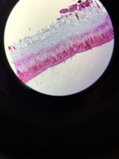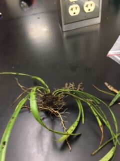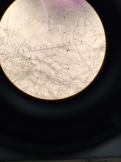 Data & Observations: The first plant we found in our transect (fig. 24) measures approximately 31 cm in length and has long, thin leaves. It has a fibrous root system and its vascular bundles, seen clearly in the cross section (fig. 25) appear to be complexly arranged. The second plant we found in our transect (fig. 26) measures approximately 13.3 cm in length and has branches with small leaves, which can be seen in detail in figure 28. The cross section (fig. 27) shows that it has vascular bundles arranged in a ring. The third plant we found in our transect (fig. 29) measures approximately 13 cm in length and has wide leaves with rigid edges and a taproot system. The fourth plant we found in our transect (fig. 30) measures approximately 9.6 cm in length and is a continuous leaf with pointed edges. A cross section of the bottom of the stem can be seen in figure 31. The fifth plant we found in our transect measures approximately 9.1 cm and has a long stem that eventually branches off into round leaves. A cross section of the stem (fig. 32) shows a triangular shape. No seeds were obtained from the transect. The fungi sporangia are small, black, globelike structures that hold spores which are released when the sporangia open. The only fungus that was obtained from the transect was identified as Tremella folicea, a gelatinous mass of leaf-like flattened lobes that are brown in color (http://www.mushroomexpert.com/tremella_foliacea.html).