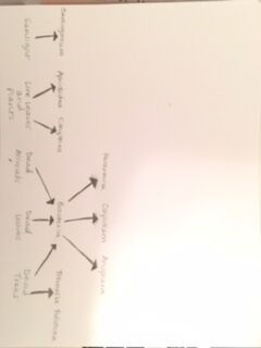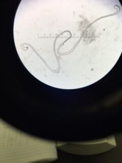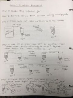 The Hay Infusion was made by placing approximately 12 grams of the transect sample (made up of 50% soil and 50% plant matter) in a plastic jar along with 500 mLs of Deerpark water and 0.1 g of dried milk. The lid was placed on the jar and it was shaken to mix the contents. After mixing, the lid was removed from the jar and it was set aside for seven days. A week later, the hay infusion was examined for the presence of protists. Initially, the foul smell was the first thing noticed. While there was no mold or green shoots seen on top of the liquid, there was a a clear film on the top of the mixture (see fig. 5). The lid was placed on the jar and it was thoroughly mixed and then samples were taken from the top, middle, and bottom of the jar (see fig. 6 and 7, respectively). From the top layer of the hay infusion we found algae that we identified as Oedogonium (see fig. 8). The Oedogonium was identified through being autotrophic, non-motile, having a grass-green color with the pigment contained in its chloroplasts, and having chloroplasts that form a network that extends from both ends of each cell. It's approximate size is 160 μM. From the middle layer, we found protozoa that we identified as Colpidium (see fig. 9). It was identified as such through its characteristics of being heterotrophic, colorless, motion by means other than sliding or floating, having cilia that covered the entirety of its body, and having a small (approximately 15 μM) oval shaped body with a small mouth. We were unable to locate any protists in the bottom layer of our hay infusion so we looked at an organism found by a different group from the top layer of their hay infusion. The protozoa found was identified as Peranema through its physical characteristics of being a heterotrophic, single colorless cell that moves by means other than sliding or floating through the use of a single flagella and appears to be vibrating while in motion yet appears to be plastic while stationary (see fig. 10). It is approximately 38 μM in size. All of the identifications of the protozoa were made using Ward's Free-Living Protozoa dichotomous key and the identification of algae was made using a dichotomous key from Connecticut Valley Biological Supply Company. The different protists found in each layer may be related to their location to plant matter (i.e. close to or far away from) depending on if they are autotrophs or heterotrophs. If the Hay Infusion culture was allowed to "grow" for another two months, I would expect to see many more organisms present assuming that all of the requirements necessary for the organisms to thrive were met. Some selective pressures that may decrease the survival ability of the organisms would be lack of space since the jar that was used for the Hay Infusion wasn't overly large, and access to sunlight (for the autotrophs) since the hay infusion is kept indoors. To determine the bacteria present in the Hay Infusion, a serial dilution of a sample taken from the infusion was performed and then the dilutions were placed onto agar plates for further investigation next week (see fig. 11 for diagram of this process).