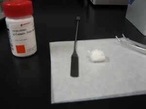 | 1. All the bovine casein constituents come in the form of a fibrous powder. I find it best to just use a pair of clean tweezers to pull out some of the casein and place it on a piece of wax paper. This is of course monumentally wrong as you are never supposed to put anything in a the container of a stock chemical. Thankfully due to the nature of the chemical, it's relatively easy to pick up wad of fiber without touching anything in the stock container.