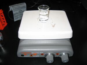 | 2. I use the spatula to tear off pieces of the casein to place on the balance. When I have the correct amount weighed out, I then place a beaker on the stir/hot plate with a stir bar in it and add the correct amount of PEM. I then add the casein to the beaker, cover it with some foil and stir (on 7) for approximately 60-80 minutes or until all the casein has gone into solution.
