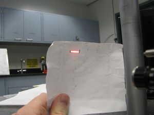 Through many trials and errors, I believe I have finally gotten the laser to do what I want it to. Below are what I did both today and some on Friday. The goal was to get the laser through the fiber so that we can put a telescope at the end and run it directly to the microscope for tweezing. Or course, I'm using an ND 3.0 to do all this. That's why the beam "looks" dim in the images below.