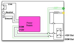 The important thing about the box is to make sure you connect the box to earth ground. Also, you should put a fuse in it just as a safety precaution to protect the power supply. I chose to have a main switch to power the power supply (green indicator LED) and another DPST switch on the front to turn on the +12VDC output to the temperature controller. This may be overkill but I got to use 2 LEDs with this setup. The green one shows the unit power on and the yellow one shows power to the temperature controller.