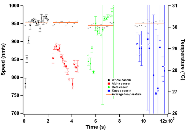 So I was finally able to run an experiment with all the different bovine caseins on my newly temperature stabilized objective. Below are the results.