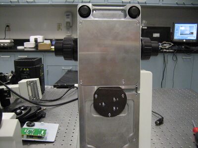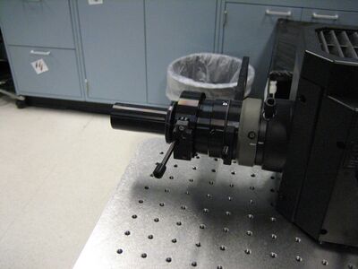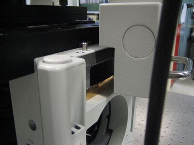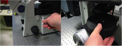 We do not have a camera attached to the microscope. We placed the camera on a 3 axis stage mounted on the table in order to reduce vibrations on the microscope. It's not necessary but it sure does make life a heck of a lot easier to position the camera in the center of the field apertures. I'd recommend it to everyone as it reduces the area you have to illuminate and thus reduces photobleaching of the sample. So why is it then that the field aperture isn't centered on the camera already? Well, there is not enough degrees of freedom to center the Hg lamp aperture on the camera due to how the lamp mounts on the microscope. So even if an engineer was able to center it in the factory, you're going to have to replace that Hg bulb at some point in time and you'll never get it in the same place again. Plus, it is super easy to place the camera focal plane at the eyepiece focal plane with a stage.