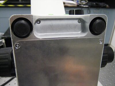 Once the knob is no longer attached, I flipped the microscope on its back to gain access to the two screws holding the front panel in place.