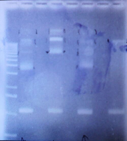 So this picture looks bad because Kelly was showing me where to make the slices, and then I squirted Ethanol all over it. But you can see there are bands. What those bands mean is up for debate, but at least one of the bands in each lane is a ligation event. But there is only one real way to find out. Time to unzip!