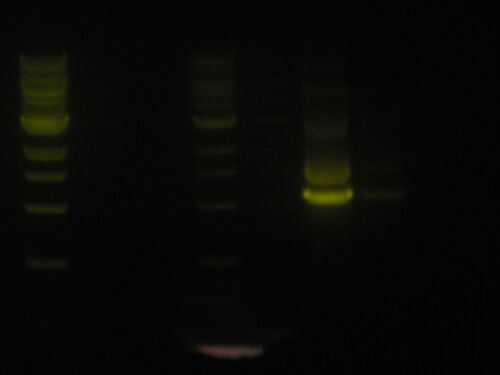 It is a little blurred, but the picture will serve its purpose. I put way too much pRL574 in and this is what I reap. I will redo the PCR reaction tomorrow and after digestion with BstXI I will run a gel of this and that and gel extract the two. I can then choose to digest this PCR reaction and gel extract that. Although I don't know if the amount of DNA I will get from this will be worth it.