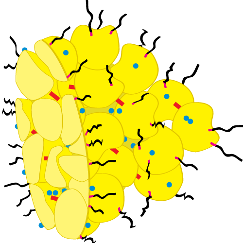 Apparently casein micelles look like what I made above. Of course this isn't definite, and I also used artistic interpretation, but it is pretty close. As I have learned in the past, casein is made up of 3 units: alpha, beta, and kappa casein. K-casein (kappa) can be found on the outside of the casein micelle as a supporting structure. Andy and I learned yesterday that k-casein has carbohydrate groups protruding from it which gives it the hairy look. I have distinguished the k-casein-carbohydrate complex with the hair and the pinkish piece. The pink is the k-casein and the hair is the carbohydrates. Each casein enzyme is the yellowish blob (made up of a- and b- caseins unless it is hairy which is all 3). The blue orbs are phosphate groups and the red boxes are calcium phosphate. The calcium phosphate helps to stabilize the micelles. I don't know what the phosphate groups do. In my image I have sliced through a casein micelle which explains the strange left feature.