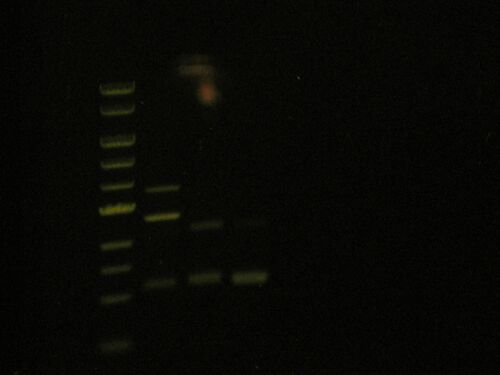Fast forward to today. I wrote up some stuff earlier in the week to do ligations yesterday. Time ran out so I had to analyze the results this morning. I had already figured that the reaction was a failure before I ran the gel and was thinking of how to adjust. I run the gel. I run the gel for too long. I decided to do a quick analysis before I allow my gel to sit in CyberSafe to restain. On quick analysis it looked like I could see 1 band before the stain disappears. I thought this band is a bit high for a failure, but I must be wrong. Let me stain and see officially. After staining, Larry and I go out for lunch. When I return I analyze the gel. I look and see some peculiar sight. "What is this? 3 bands? Those other 2 lanes only have 2 bands. Hmm, what is that? And why are those two bands lower than the middle band in lane 2?"